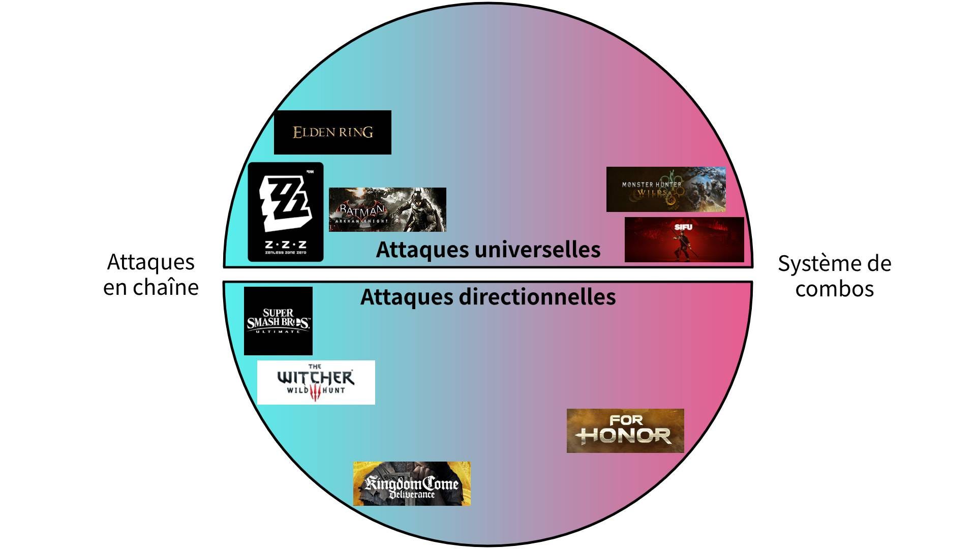 Dans “Sifu”(2022)(vidéo de gauche), les coups sont rapides pour calquer sur la fantaisie des films de Kung-fu, alors que “For Honor”(2017)(vidéo de droite) a un délai plus long et des mouvements plus amples entre les attaques, traduisant la pesanteur d’un combat en armure médiévale.