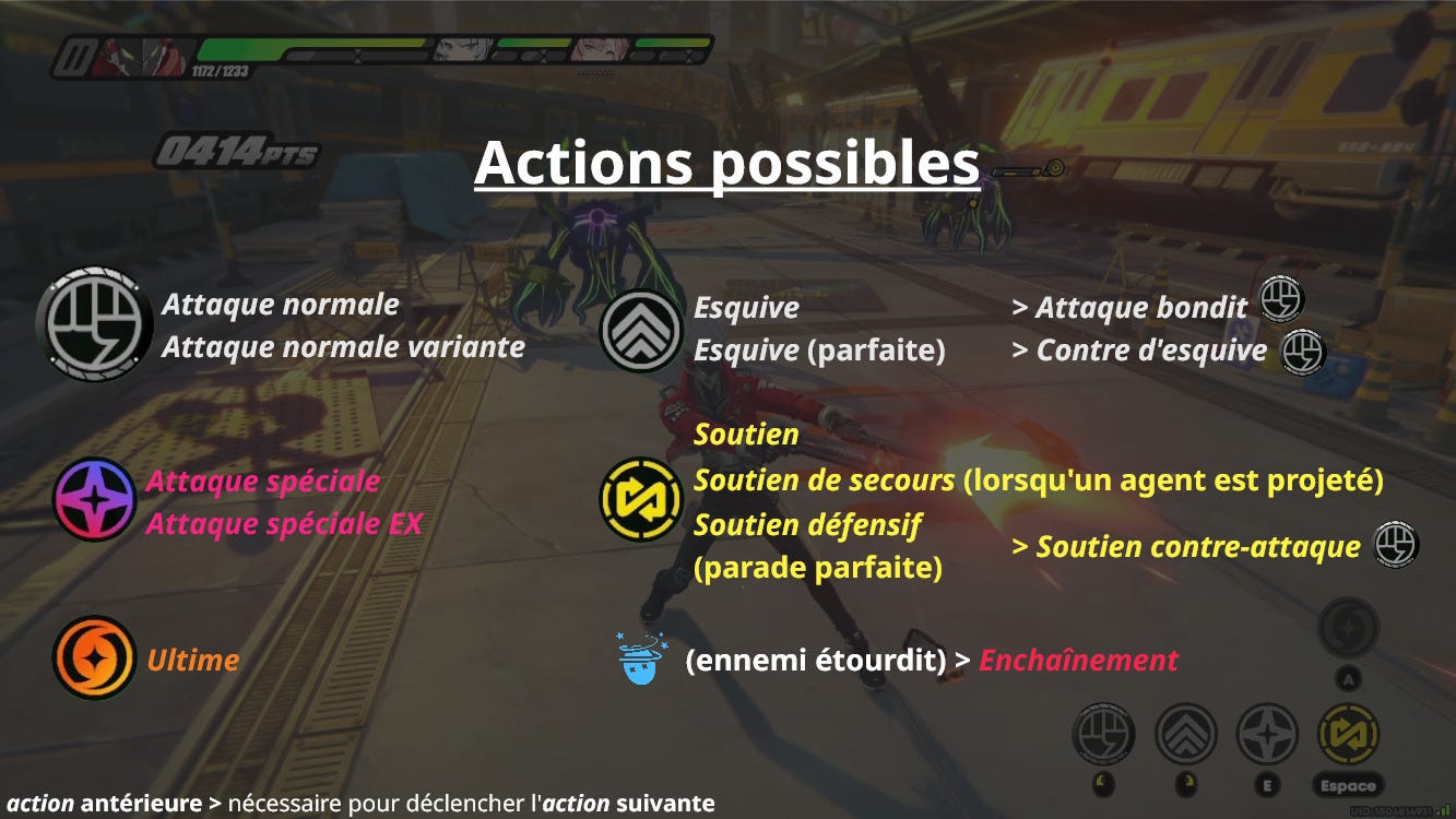 La base d’actions est commune à tous les agents, ce qui implique de pouvoir jouer n’importe lequel d’entre eux une fois les fondements appris. Cela réduit grandement la charge cognitive lors d’un changement de personnage.