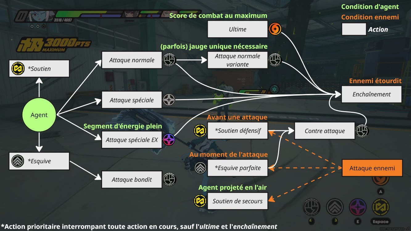 NOTE : dans ZZZ, le jeu va prêter des agents lors des missions d’histoire, correspondant aux personnages impliqués dans la narration de la mission. La compréhension et l’utilisation des variantes dans les attaques, grâce au ‘timing’, n’est pas nécessaire pour terminer l’histoire principale du jeu (5 chapitres lors de la v1.7), car les statistiques des agents prêtés sont automatiquement adaptées au niveau de difficulté de la mission. Cependant, maîtriser les variantes devient indispensable pour vaincre le contenu de fin de jeu, car les difficultés supérieures proposent de nombreux défis chronométrés ou des enchaînements de combats avec des modificateurs puissants, et les joueurs et joueuses doivent composer leur propre équipe. Apprendre à optimiser son équipe, l’utilisation des passifs, des attaques, des variantes, des anomalies et la jauge de confusion, est essentiel pour venir à bout de ces défis.