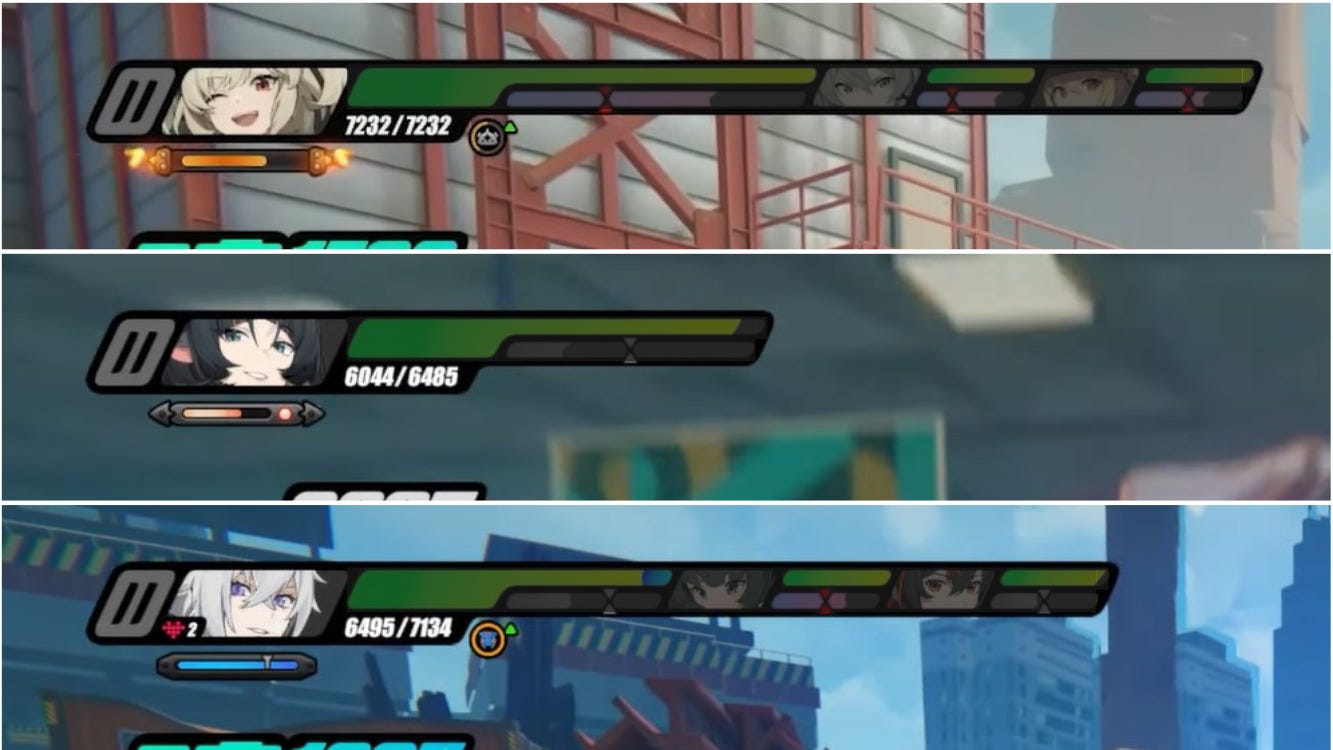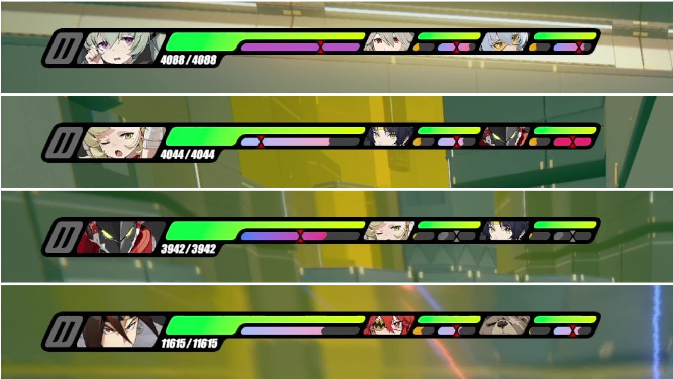 Compilation de l’affichage des PV, barres d’énergie et seuil d’activation de multiples agents, en jeu. La taille des segments d’énergie consommée ainsi que le seuil d’activation varient en fonction des personnages, ce qui modifie la fréquence de disponibilité de leur spéciale EX. Ces deux variables d’ajustement permettent de créer des variations entre les agents.